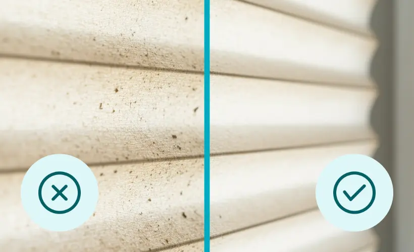Usuwanie kurzu z plis działa podobnie jak w przypadku mebli. Zalecamy czyszczenie na sucho – w większości przypadków wilgotna ściereczka nie jest potrzebna, a nadmiar wilgoci może uszkodzić tkaninę.
