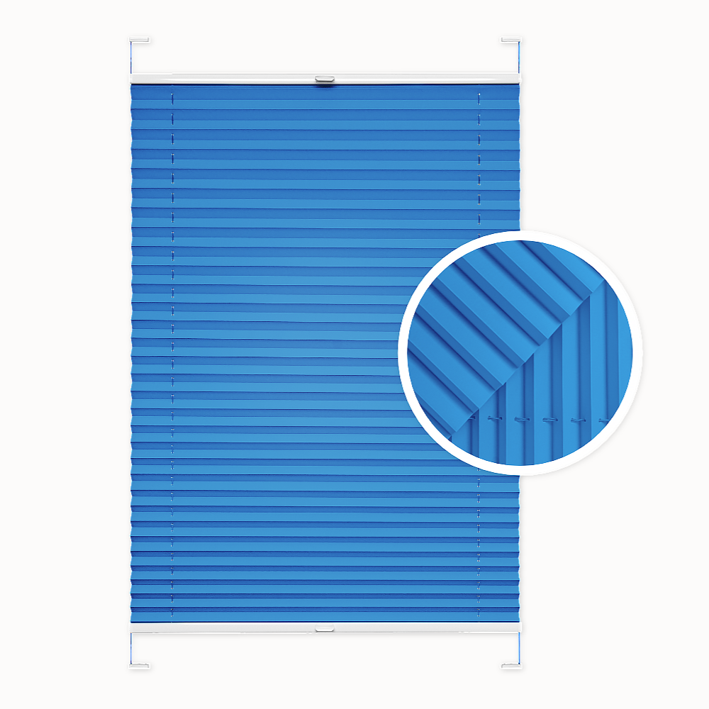 Pleated blind. Color: Blue. Installation with or without drilling. Custom-made. Width: 30–140 cm. Height: 40–230 cm. Blackout level: approx. 50%