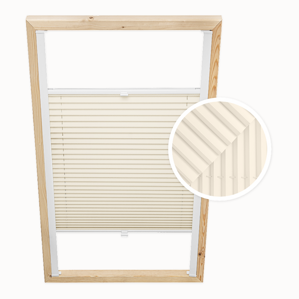 Custom skylight pleated blind. Color Ivory. Screw-mounted installation. Width: 30-120 cm. Height: 30-150 cm. Blackout: approx. 50%.