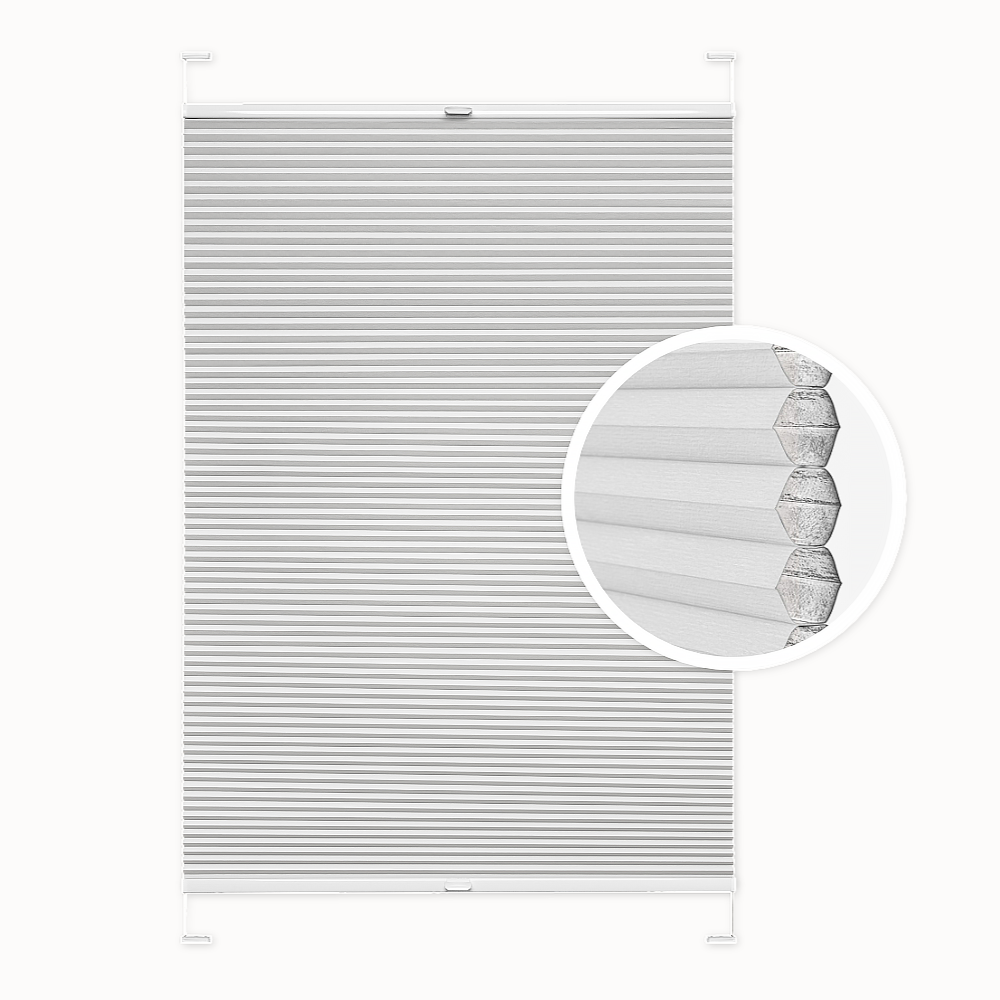 Plisa okienna plaster miodu (honeycomb). Kolor jasnoszary. Montaż inwazyjny lub bezinwazyjny. Na wymiar. Szrokość: 30-130 cm. Wysokość: 40-230 cm. Zaciemnienie: 100%.