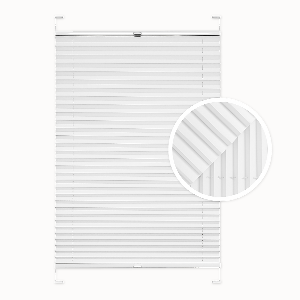 Plisa okienna. Kolor biały. Montaż inwazyjny lub bezinwazyjny. Na wymiar. Szerokość: 30-140 cm. Wysokość: 40-230 cm. Zaciemnienie: ok. 50%