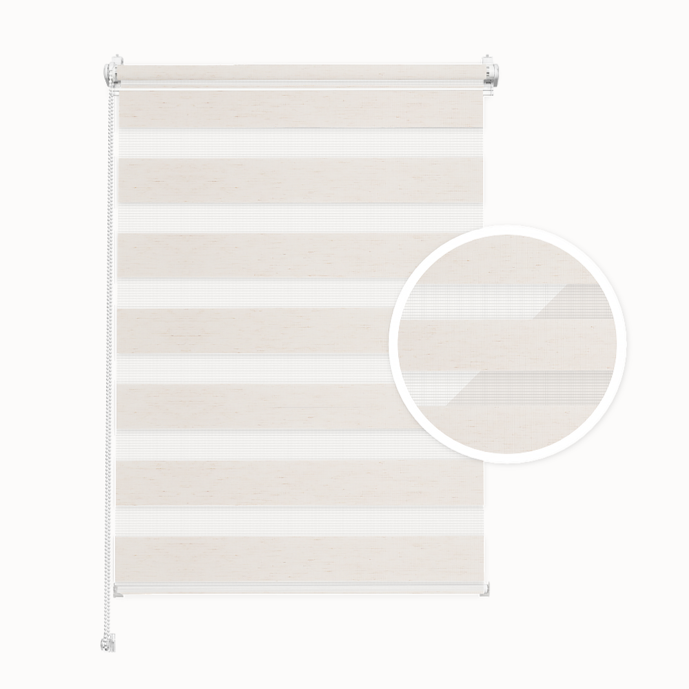 Roleta Dzień-Noc. Kolor kremowa. Montaż bezinwazyjny. Na wymiar. Szrokość: 30-150 cm. Wysokość: 120, 150 lub 220 cm. Zaciemnienie: ok. 50%.