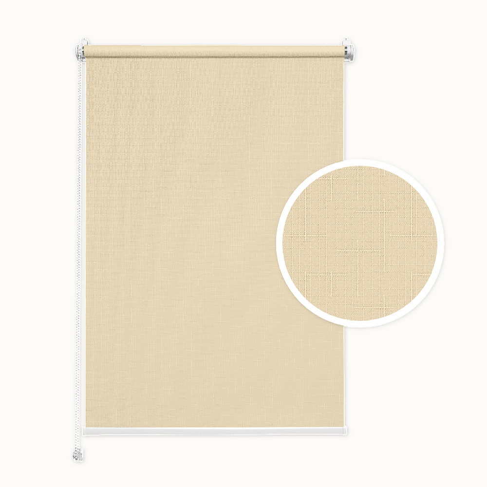 Roleta mini. Kolor kremowy. Montaż bezinwazyjny. Na wymiar. Szerokość: 30-150 cm. Wysokość: 150 lub 220 cm. Zaciemnienie: ok. 50%.